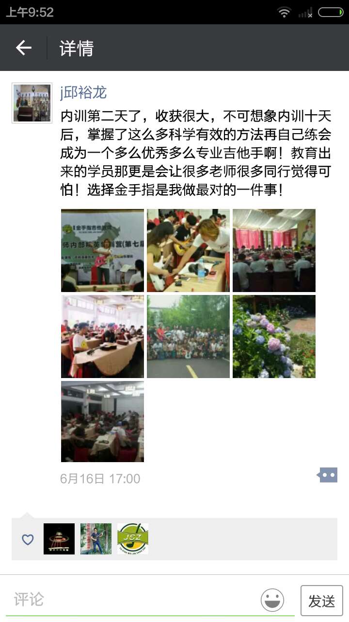 邱老师:我一直很崇拜余老师,余老师编写过的很多吉他教程我都学习过,金手指今年4月一来福建开宣讲会,我立马就报名了,通过两天学习后,我毫不犹豫就加盟金手指,因为金手指教学体系相当系统全面,解决了我在少儿吉他教学方面存在的种种疑问;金手指每年还定期举办精英内训,在我加盟金手指两个月后,便参加了三星级教师内部精英集训营(第七届),十天的精英内训让我更全面认识了金手指教学体系,得到余老师手把手的指导,我非常激动和开心,回到机构运用金手指体系教学后,效果显著,学生们上课积极性大大提高,现在他们一节课就能跟上节奏弹唱了,家长对此相当满意,口口相传后,吸引了更多家长带着孩子来我这里学习,我现在教学思路很清晰,很有信心让我的学生得到全面提高,非常感谢余老师,余老师认真做事的态度和精神深深影响了我,我会用实际行动回报余老师,将金手指教学发扬光大!