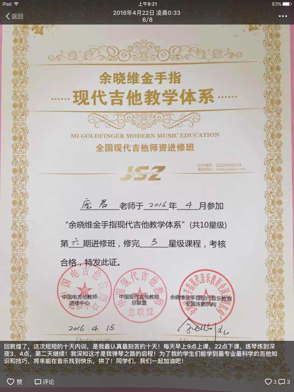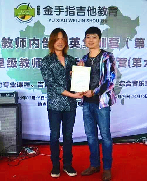 庞君老师于2016年1月正式加盟余晓维金手指吉他教育,并在同年4月参加“金手指吉他集体课教学体系”三星级教师内部精英集训营(第六届),以优异成绩获得三星级教师资格证书。