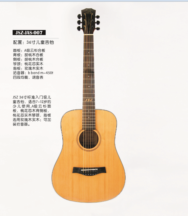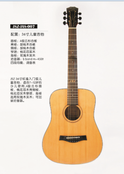面板:A级云杉合板 背板:胡桃木合板 侧板:胡桃木合板 琴颈:桃花芯实木 指板:玫瑰木实木 拾音器:无