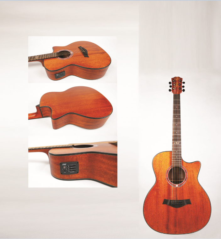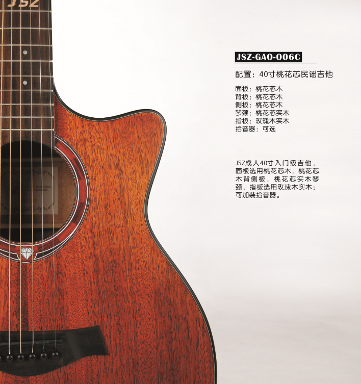 面板:桃花芯木合板 背板:桃花芯木合板 侧板:桃花芯木合板 琴颈:桃花芯木实木 指板:玫瑰木实木 拾音器:可选