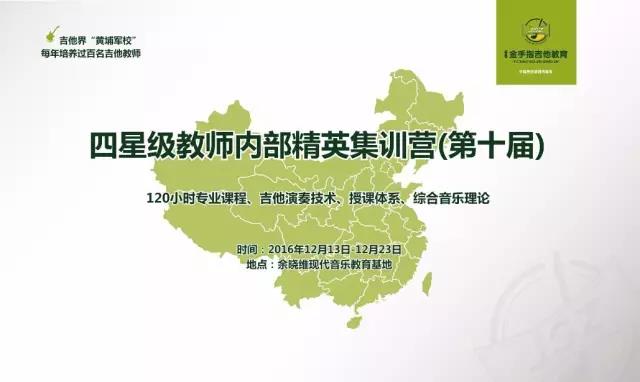 千呼万唤始出来啦,三星级教师内部精英集训营(第九届)刚开营没几天,金手指吉他教育全国校长群便骚动了起来,参加过三星级内训的老师们看着正在受训的老师朋友圈记录的课堂场景,已经禁不住要参加四星级教师内部精英集训营了,为此,总部决定将于12月13-22日在总部教学基地举办四星级教师内部精英集训营(第十届),本届内训以讲解《余晓维现代吉他教程》第二学年课程内容以及教学法,通过考核的教师将获得总部颁发的五星级教师资格认证书。