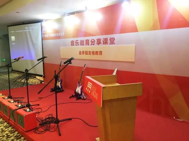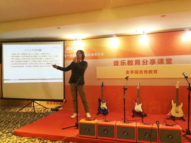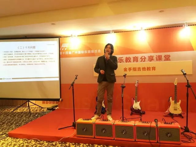 24日上午10:30-11.15由余晓维金手指吉他教育创始人余晓维主讲的“金手指现代吉他教学体系”音乐分享课堂准时开讲,讲座上,余老师结合自己亲身经历,用大量生动的案例、视频,针对当前吉他教育机构存在的问题展开讲演,娓娓道来,深深吸引了大家。讲座现场气氛非常活跃,在场的朋友们不仅增长了吉他教学方面知识,更在讲座中深刻体会到“金手指现代吉他教学体系”的独特魅力。