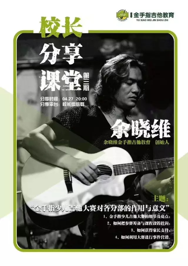 2017年,金手指吉他教育总部将开展“中国吉他教育传播者—金手指吉他全国优秀校长分享课堂直播”活动,通过“品牌、教学、活动、产品”四个方面来分享办学经验。提升高效课堂教学水平,促进交流学习,推进各分部共同成长。