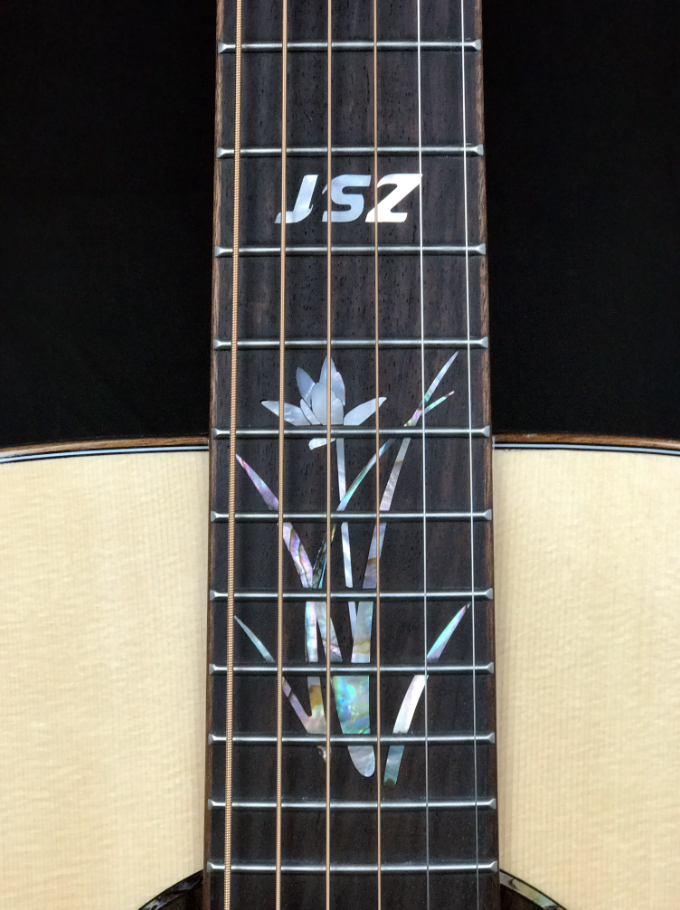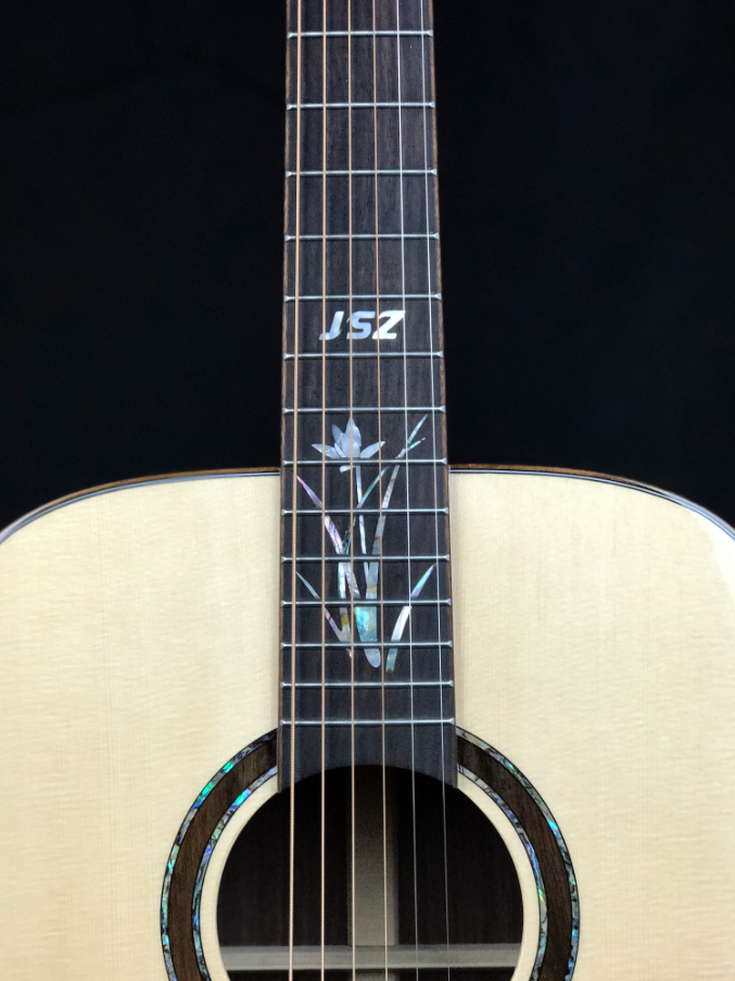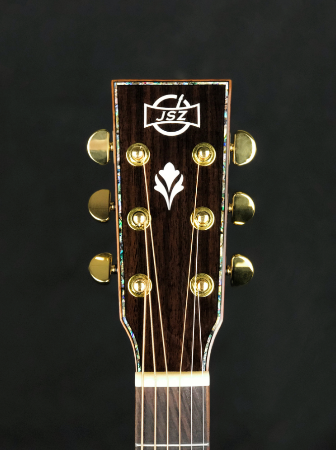 与琴颈一体的琴头大气美观,以白色贝壳镶嵌“JSZ”LOGO及象征着万物复苏的花开图案