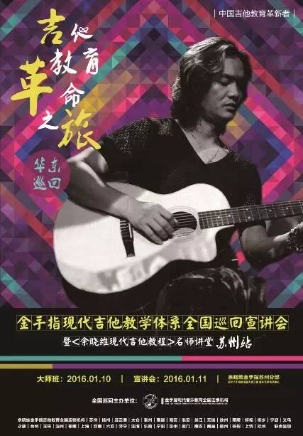 为答谢老师及家长们的支持与厚爱,为让更多吉他教育从业者提高自身专业素养,学习“金手指现代吉他教学体系”,余晓维金手指吉他教育在今后将携手更多分部陆续举行全国巡回宣讲会,届时将为大家奉上多场“名师讲堂”活动。在2016这新的一年里,让我们的生活与吉他来一场完美的邂逅吧!(PS:想要参加宣讲会及名师讲堂的朋友请拨打电话18607169404预定席位!)